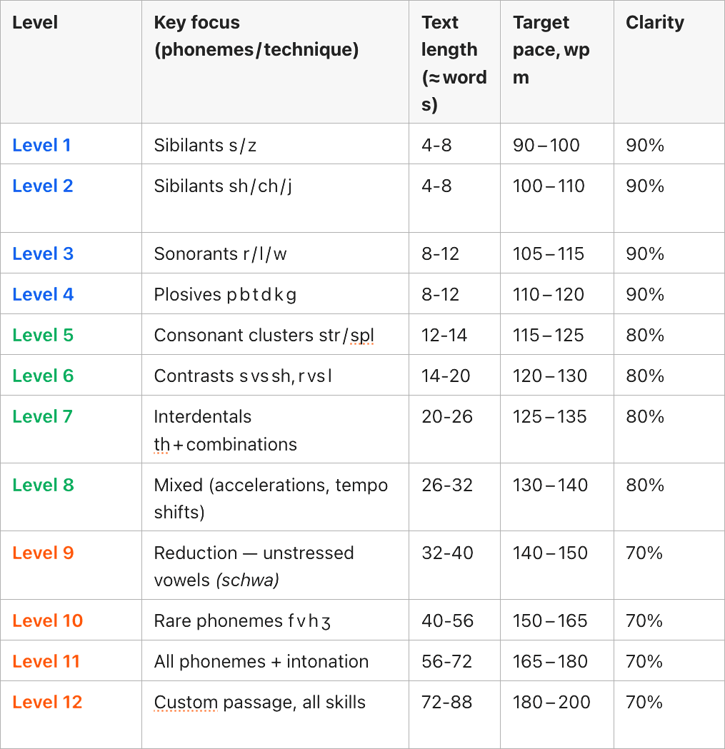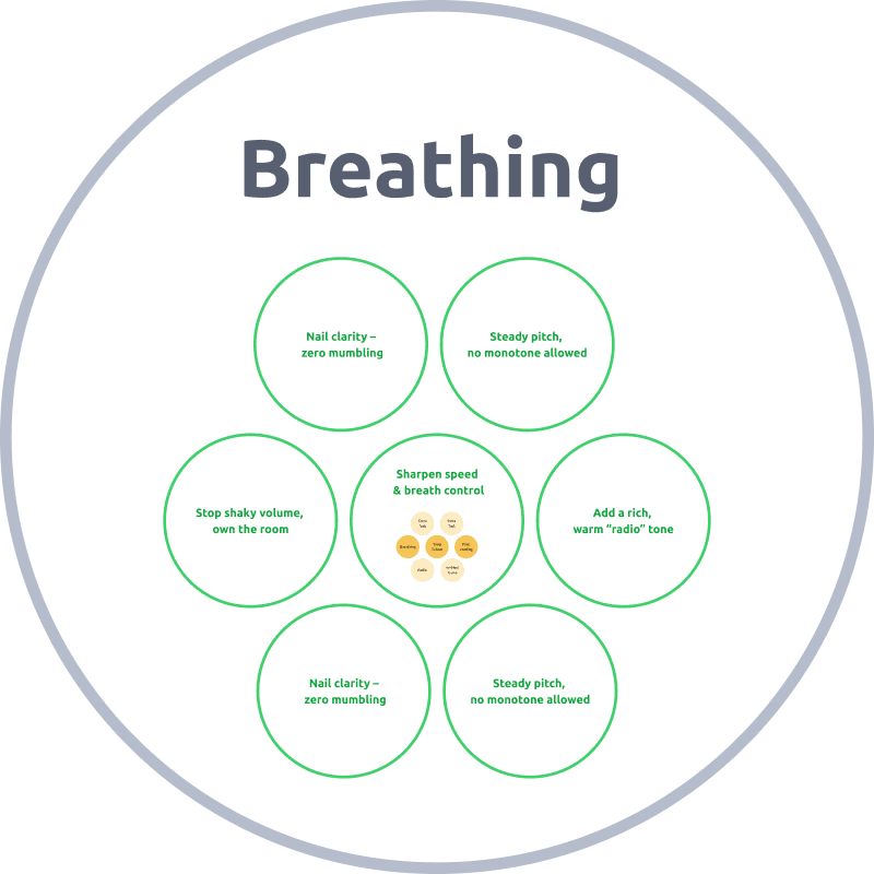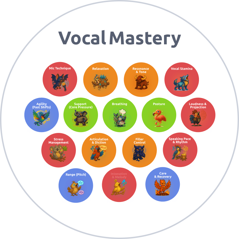Level 2: Relaxation, Resonance & Tone, Articulation & Diction, Filler Control.